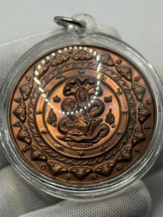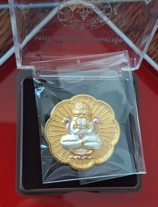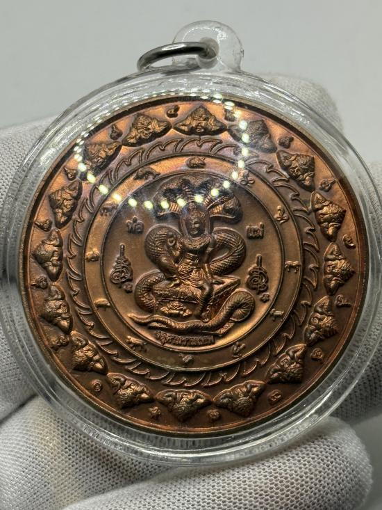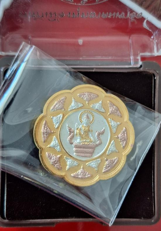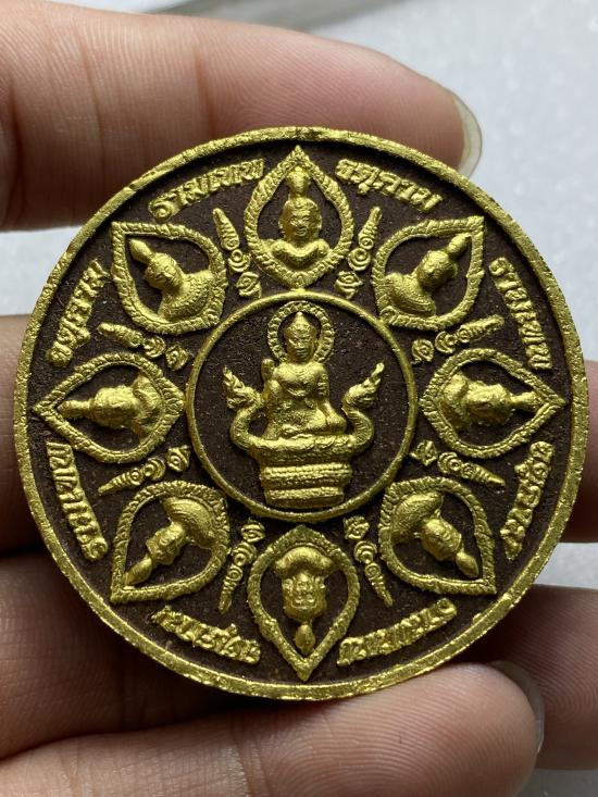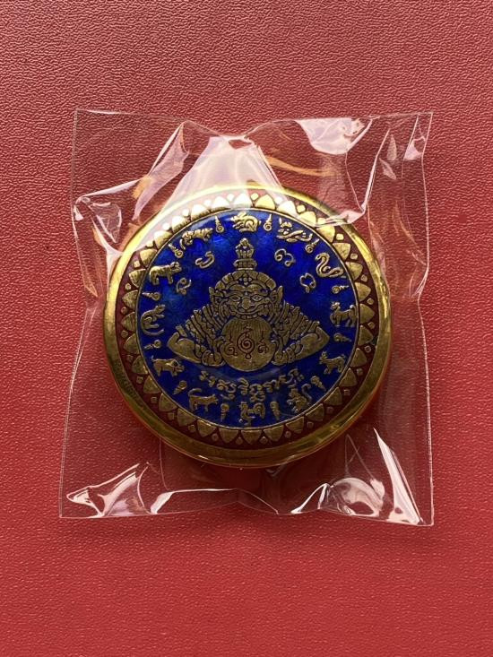 เคาะเดียวแดง สีผึ้งพระราหู รุ่น มงคลจักรวาล เนื้อ โลหะชุบทองลงยาน้ำเงินขอบแดง ขนาด5ซม |