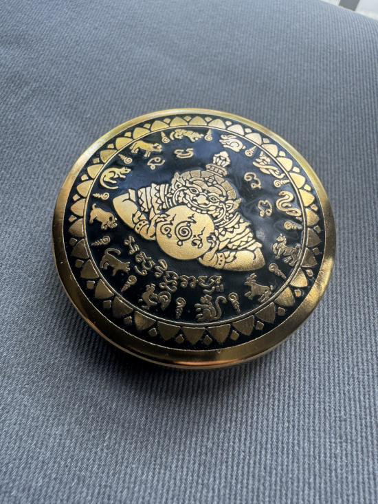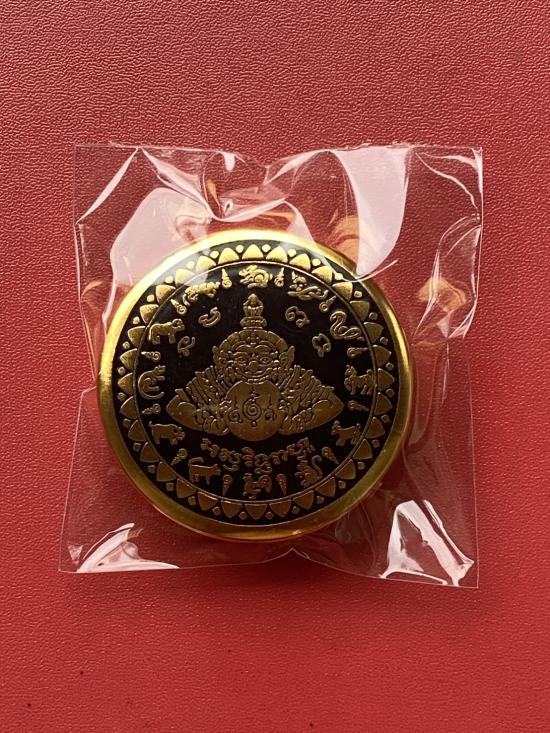 เคาะเดียวแดง สีผึ้งพระราหู รุ่น มงคลจักรวาล เนื้อ โลหะชุบทองลงยาดำขอบแดง ขนาด5.5ซม |