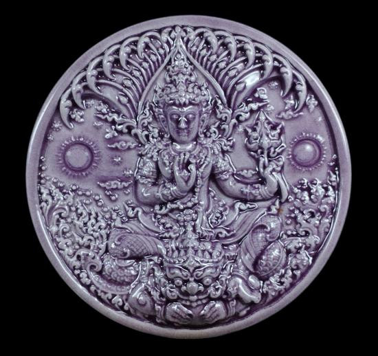 จตุคามรามเทพ เนื้อกระเบื้องเคลือบเบญจรงค์สีน้ำเงิน รุ่นบารมีเศรษฐีเงินล้าน 5 ซ.ม. เลข 3103 กล่องเดิม |