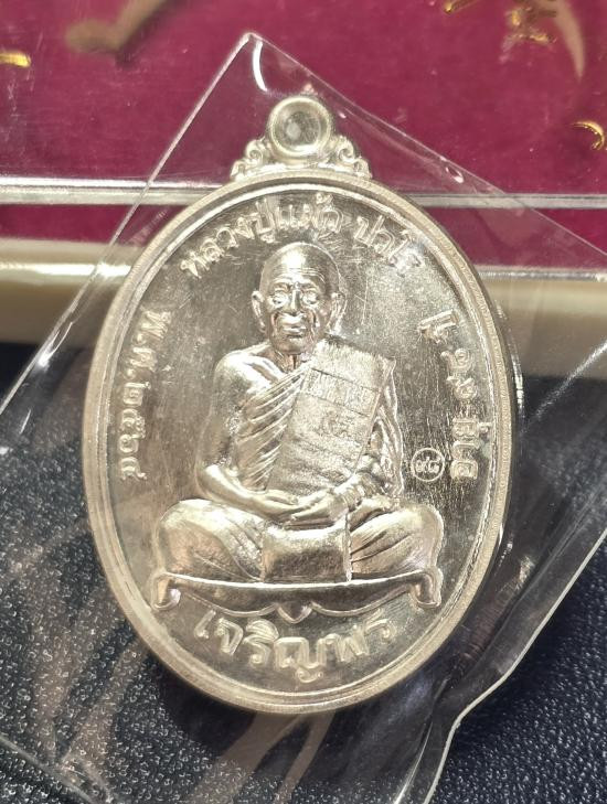 เหรียญเจริญลาภ หลังสมเด็จโตอุ้มบาตร หลวงปู่กาหลง เขี้ยวแก้ว วัดเขาแหลม อายุครบ 90 ปี เนื้อเงิน ตอกโค๊ต ตอกเลข สภาพสวย นอ นกล่องเดิม |