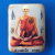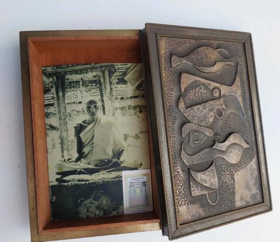 ภาพ หลวงพ่อน้อย อินทสาโร วัดธรรมศาลา กับกล่องไม้โบราณหุ้มด้วยโลหะ ลวดลายนูนต่ำ |