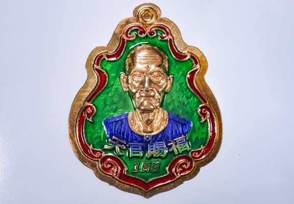 หลวงปู่ดู่ วัดสะแก ฉากเขียว จีวรส้ม ซีเปีย พิมพ์รูปไข่ หลังยันต์ เนื้อตะกั่ว ปี 53 พร้อมเลี่ยมใส |
