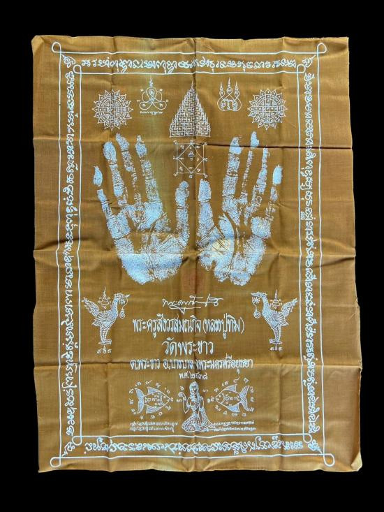 ผ้ายันต์ฝ่ามือ หลวงปู่ทิม วัดพระขาว สีกรัก ปี 38 ปีลึกมาก ได้รอยมือหลวงปู่ด้วย ผืนนี้พิเศษหลวงปู่ปิดทองให้ที่รอยฝ่ามือทั้ง 2 ข้าง |