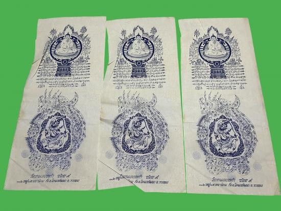 จัดไป 3 ผืน....ผ้ายันต์พระพุทธธรรมจักรทิพย์ญาณไตรโลก วัดหนองระกำ อาจารย์หม่อมเขียนออกแบบยันต์ หลวงปู่ละมัยปลุกเสก ขนาด 112x47 ซ.ม. ผืนใหญ่ ชุดที่ 6 (ผ้ายันต์ สกรีนสีน้ำเงิน) |