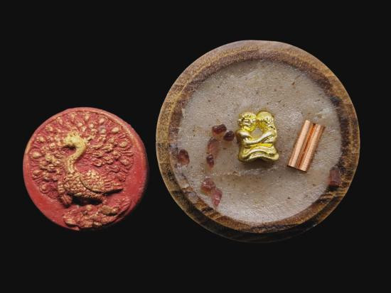 เคาะเดียวแดง พญายูงคำ รุ่นแรก เนื้อแดงปัดทอง และ ตลับไม้สีผึ้งเนื้อหอม รังผึ้งร้าง ขวางเดือนขวางตะวัน รุ่นแรก ฝังอิ่น ตะกรุด ในเมตตาบารมี เจ้าปู่จั่นต่า กาวิสาละ ครูบากฤษดา เมตตาเษก |