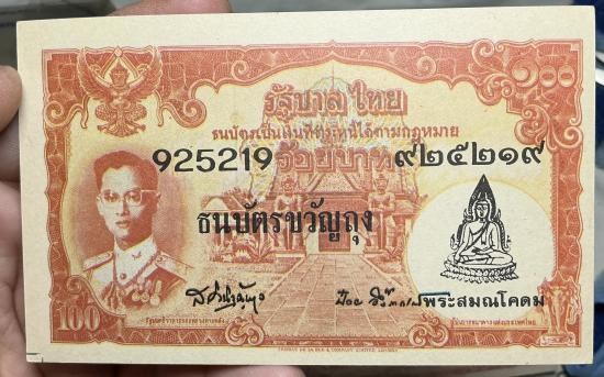 แดงที่120 บาท ธนบัตรขวัญถุง พระพุทธโคดม เลข 9 หน้า 9 หลัง มีจารอักขระยันต์ ไม่ทราบที่ |