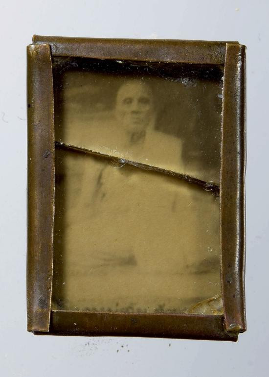 รูปถ่ายสีซีเปียพระอาจารย์เบ๊นซ์ วัดราชาธิวาส หลังแผ่นตะกั่วจารยันต์ ตอกเลข 62 |