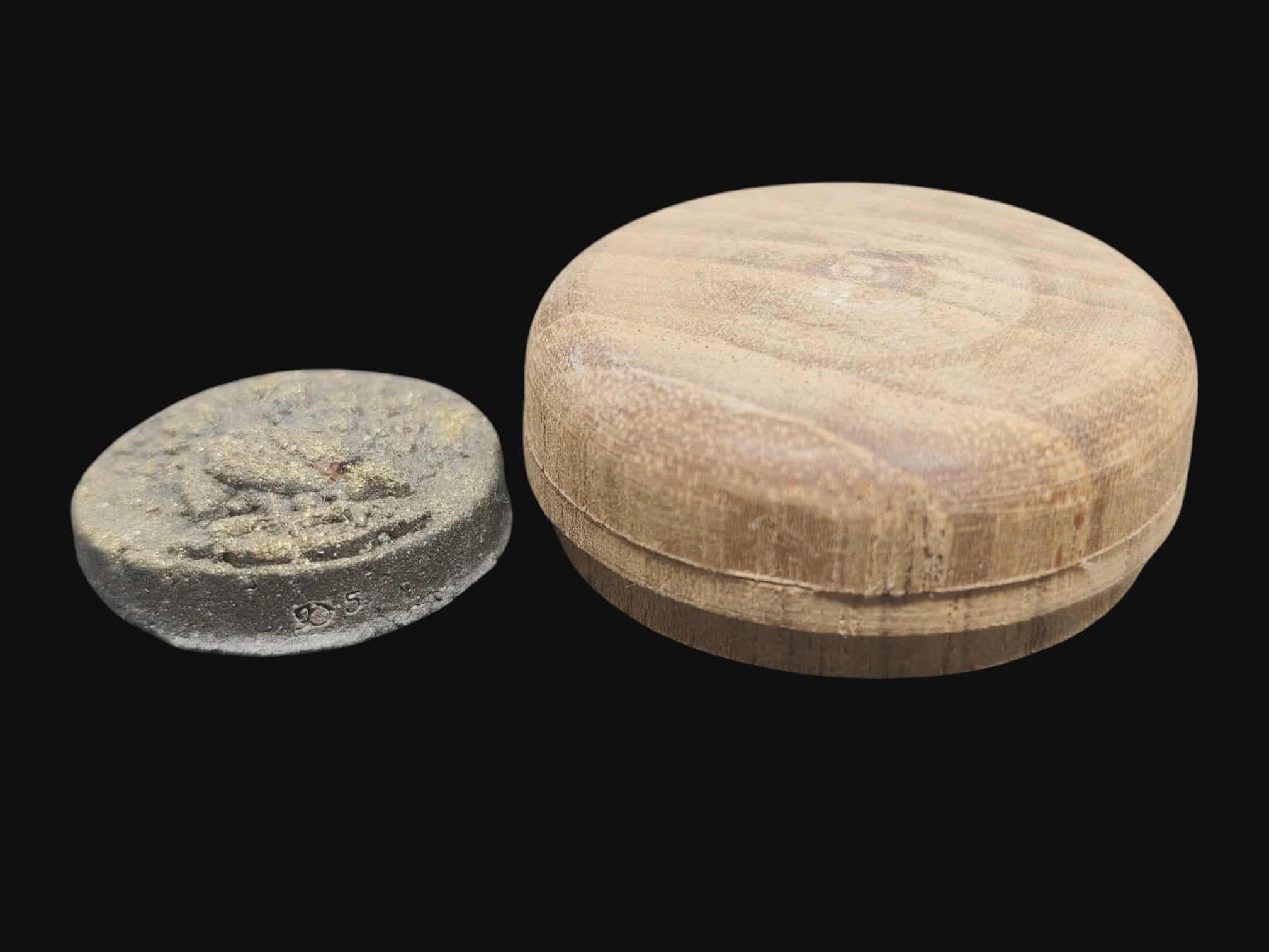เคาะแรกแดง ตลับสีผึ้งโลหะ ด้านในฝังเหรียญกลม ไม่ทราบเกจิ สีผึ้งเก่ามีอายุ รับประกันตามกฎค่ะ |