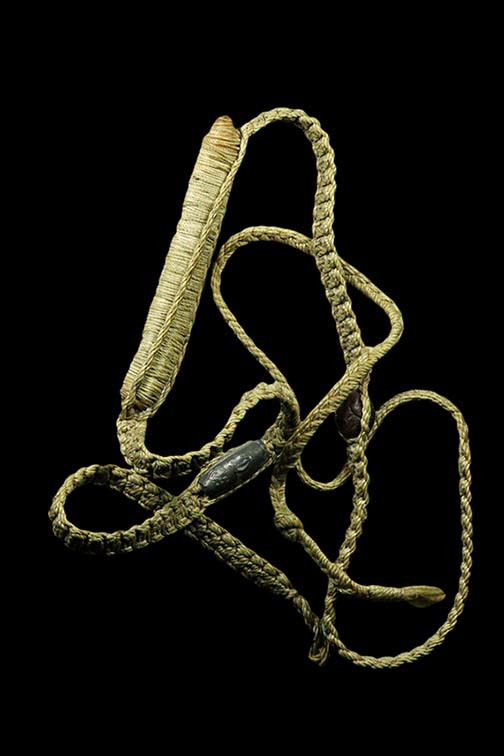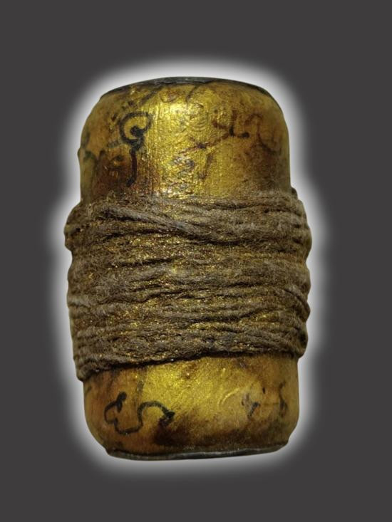 ตะกรุดพิสมรสองห่วง ปิดทอง ถักเชือกไนลอน ตามแบบ เกจิสายนครปฐม เก่าม่ทราบที่ ขนาดยาว 2 ซม. |