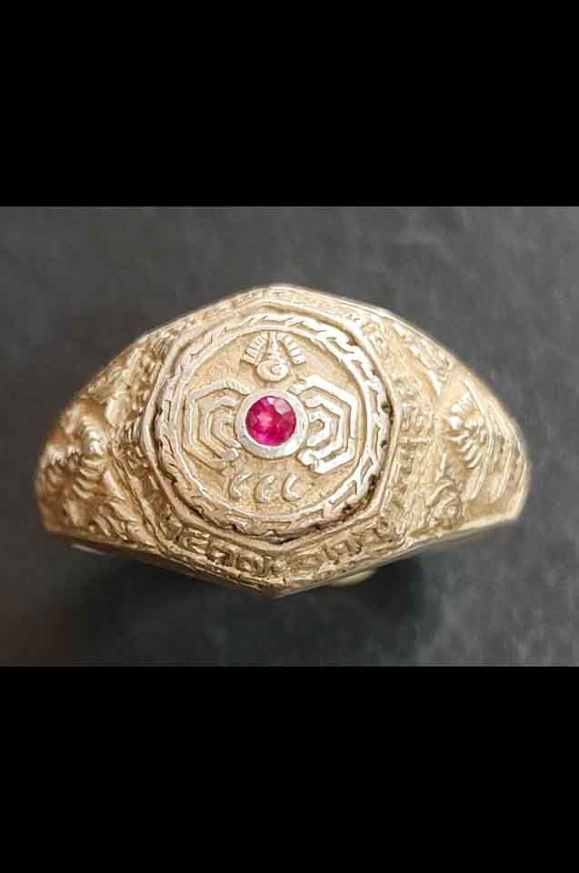 วัดใจ 100 แหวนหัวยันต์ฝังพลอยสีแดง หลวงพ่อชื้น วัดญาณเสน จ. อยุธยา เนื้อเงิน ปี 37 ตอกโค๊ต-วงใหญ่ขนาด เส้นฝ่าศูนย์กลาง 2.3 ช.ม. |