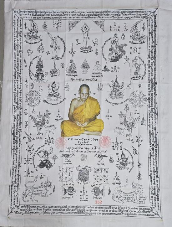 ผ้ายันต์หลวงปู่ชื่น วัดตาอี จ.บุรีรัมย์ ปี2545 ผืนใหญ่ 55 x 75 ซ.ม. หายาก หมายเลข 352 ครับ |