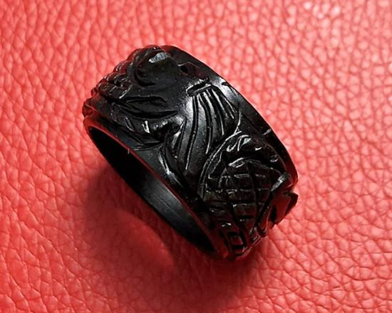 แหวนหยกดำแกะลายมังกร หยกพม่าแท้ 100 % (แสงส่องผ่าน) เส้นผ่าศูนย์กลาง 2.3 ซม. หนา 1.3 ซม. วงใหญ่ๆ หายากมาก ไม่ค่อยได้มาบ่อย ราคาค่อนข้างสูง (กท.71) |