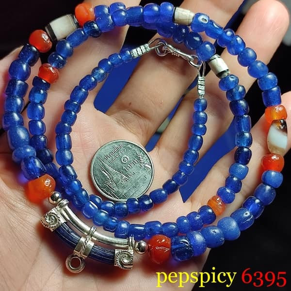 *เคาะแรกแดง* สร้อยลูกปัดแก้วโบราณยุคทวารวดีอายุกว่าพันปี คัดโทนสีน้ำเงินกษัตริย์ ร้อยประดับลูกปัดโบราณหินส้มคาร์เนเลียน หินอาเกต พร้อมคานห้อยพระชิ้นส่วนกำไลเนื้อลูกปัดแก้วโบราณจับเงินแท้สวยงามพร้อมใช้ |