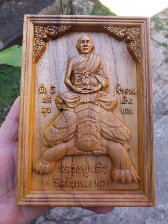 199.แดง ไม้สักแกะสลักมงคล หลวงปู่หลิว ขนาด 14 ซม.สูง20ซม.หนา2.5ซม +ขาตั้ง |