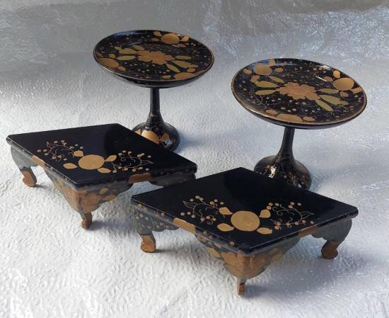 ชุดเครื่องบูชาขนาดเล็ก 4 ชิ้น เครื่องเขินญี่ปุ่น (ชิกกิ) ขนาดเล็ก ซึ่งตกแต่งด้วยเทคนิคที่เรียกว่า มากิเอะ (Maki-e) |