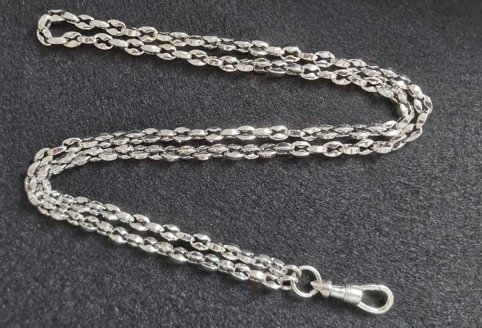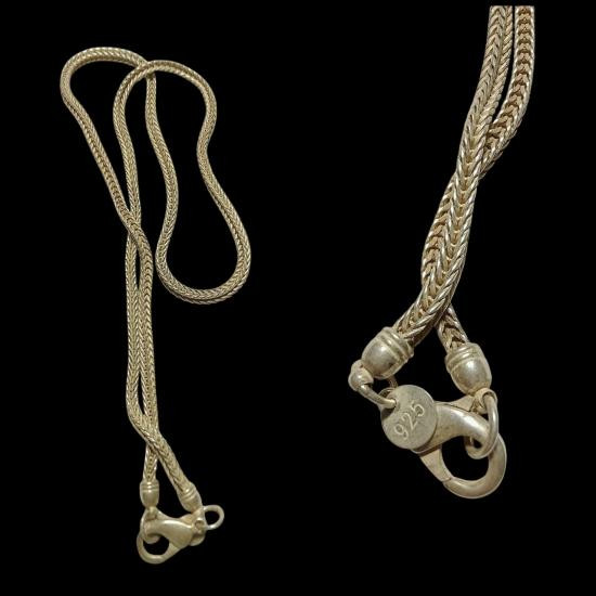 สร้อยโลหะ ชุบเงิน ยาว22นิ้ว นำ้หนักประมาณ2บาท สภาพตามรูป ไม่ใช่เนื้อเงิน นะครับ |