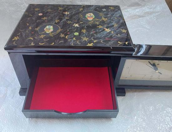 กล่องเครื่องประดับ 3 ลิ้นชัก พร้อมนาฬิกาตั้งโต๊ะ Miyabi สภาพสวย งาน Japan กว้าง 21 cm สูง 21 ใช้งานได้ปรกติ |