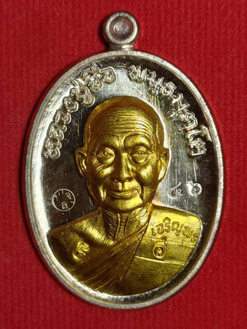 เหรียญหลวงปู่จื่อ พันธมุตโต รุ่น เจริญพรสังฆฏิ ออกวัดแจ้งนอก ปี 59 เนื้อ เงินหน้าทองคำ หมายเลข 46 สภาพสวย เคาะเดียวแดง