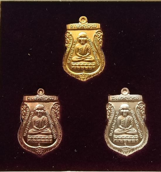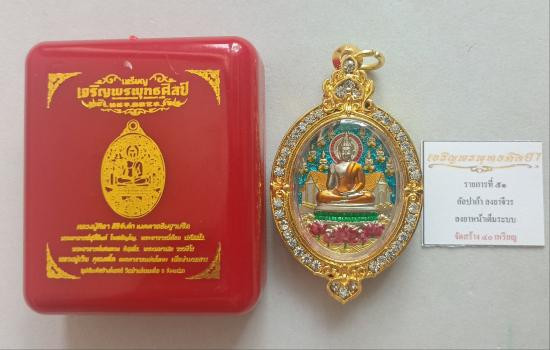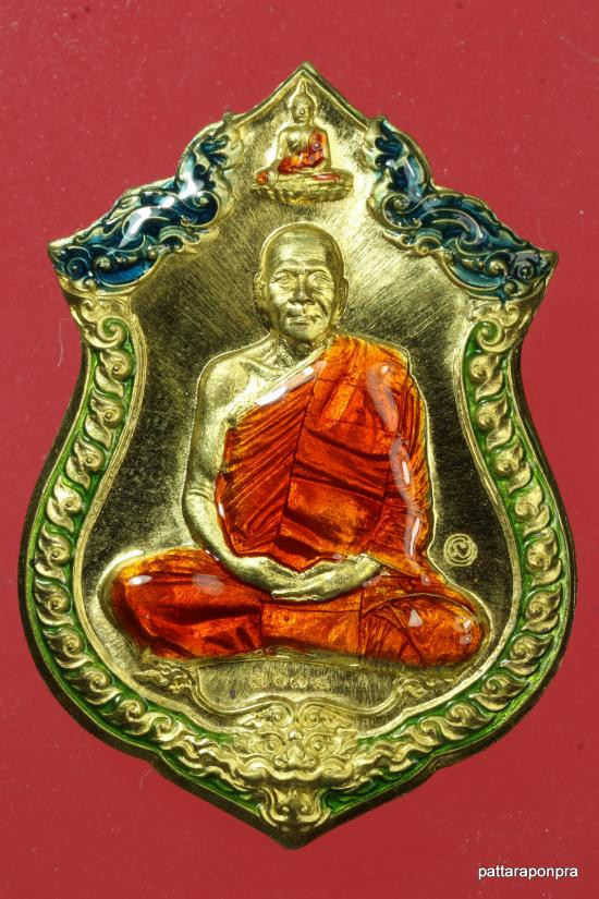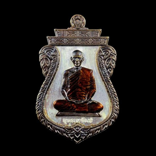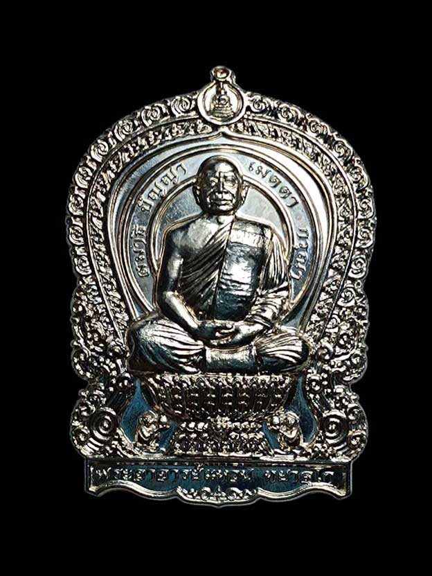 พระอาจารย์ต้อม วัดท่าสะแบง จ.ร้อยเอ็ด รุ่นอุดมทรัพย์ พิมพ์เสมา ( รายการ 4.1 เนื้อเงินหน้ากากมหาชนวน ขอบมหาชนวน ลงยาจีวร ) No.205 พร้อมกล่องเดิม |