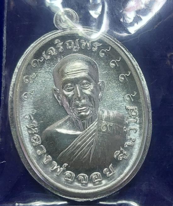 {เหรียญเจริญพร หลววพ่อจอย ชินวโส เนื้อเงินหลังเรียบ๙รอบ ไม่ตัดปีกหลังแบบ 98 วัดโนนไทย ปี 2558 (หลวงพ่อคูณร่วมปลุกเสก) |