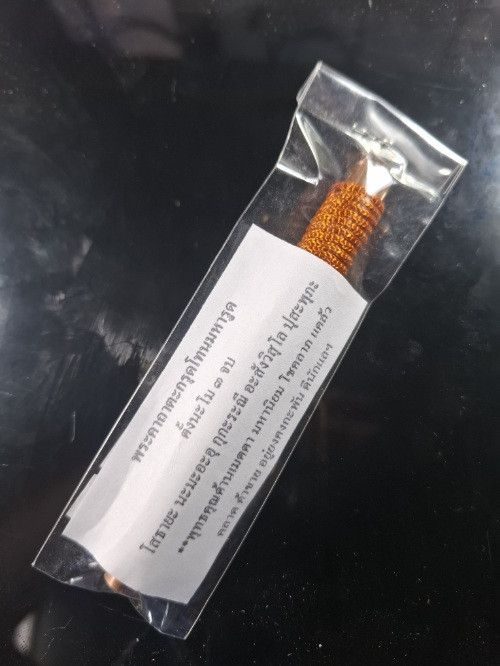 เบี้ยแก้ หุ้มจีวร ถักเชือก หลวงปู่ศิลา วัดโพธิ์ศรีสะอาด มีแผ่นเลขกำกับ ฝังตะกรุดทองเหลือง พร้อมใบคาถา ปี2567 |