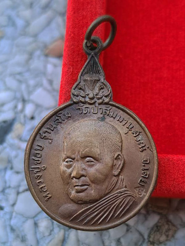 เหรียญหลวงปู่ชอบ ฐานสโม รุ่นที่ระลึกสร้างเจเดีย์ ปี 2518 วัดป่าสัมมานุสรณ์ จ.เลย เคาะเดียวแดง |
