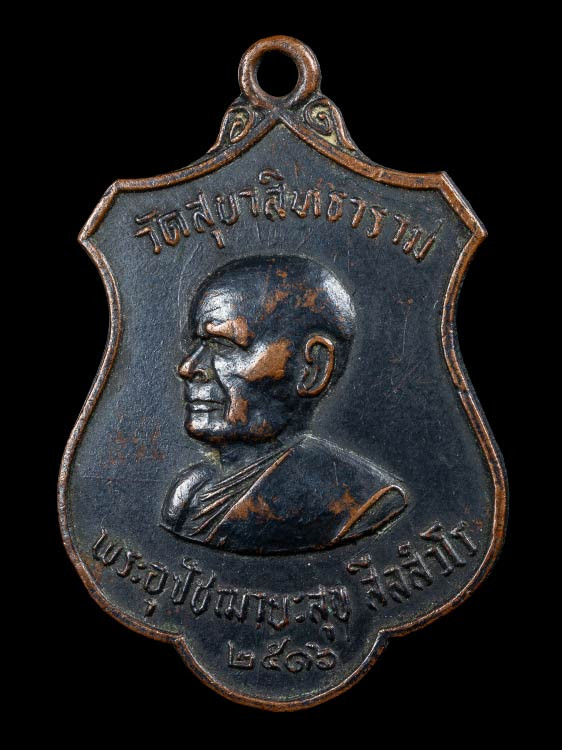 เหรียญปั๊มพิมพ์เตารีดเล็ก หลังหนังสือ หลวงพ่อสีทันดร วัดนาท่วม จ.ตรัง ปี 2506 นิยมมีหูมีเม็ดตา |