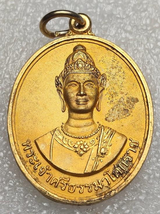 เคาะเดียวแดง ....เหรียญพระเจ้าศรีธรรมโศกราช วัดพระมหาธาตุวรมหาวิหาร จ.นครศรีธรรมราช พ.ศ.2546 เนื้อกะไหล่ทองพ่นทรายปัดเงาบางส่วน |