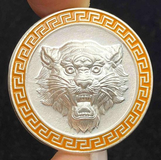 เหรียญหลวงพ่อประสูติ วัดถ้ำพระพุทธโกษีย์((วัดในเตา ตรัง เหรียญนำฤกษ์ หมายเลข 1 เนื้อชนวนมวลสารเชื่อมห่วงเงินหน้ากากชุบทองหลังหน้ากากเสือชุบพริ้งโกล |