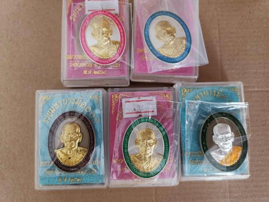 เหรียญรวยมหาบารมี100ปี เนื้ออัลปาก้า หน้ากากทองทิพย์ ลงยาขอบ 5 องค์ กล่องครบ หลวงพ่อพัฒน์ วัดห้วยด้วน |