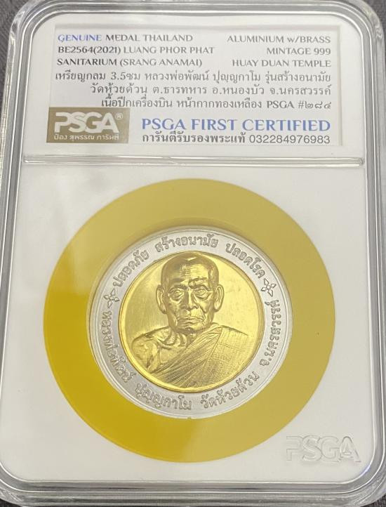 เปิดประมูลเหรียญ รุ่นสร้างอนามัย หลวงพ่อพัฒน์ เนื้อปีกเครื่องบิน หน้ากากทองเหลือง เลข๒๘๔ใส่ตลับ PSGA |