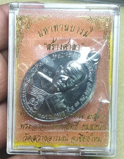 เหรียญพระอาจารย์พรสิทธิ์ วัดสว่างอารมณ์ รุ่นสร้างศาลาไม่ทราบเนื้อ เลี่ยมเงินหนาๆครับ |
