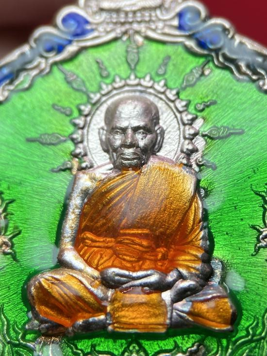 เหรียญ "เจ้าสัว" หลวงพ่อพัฒน์ วัดห้วยด้วน (จัดสร้างโดย บอย ท่าพระจันทร์) เนื้อเงิน ลงยาจีวรขอบสีเขียว หลังชนวน เบอร์ 1922 พร้อมกล่องครับ (เหรียญหนัก 18.56 กรัม)