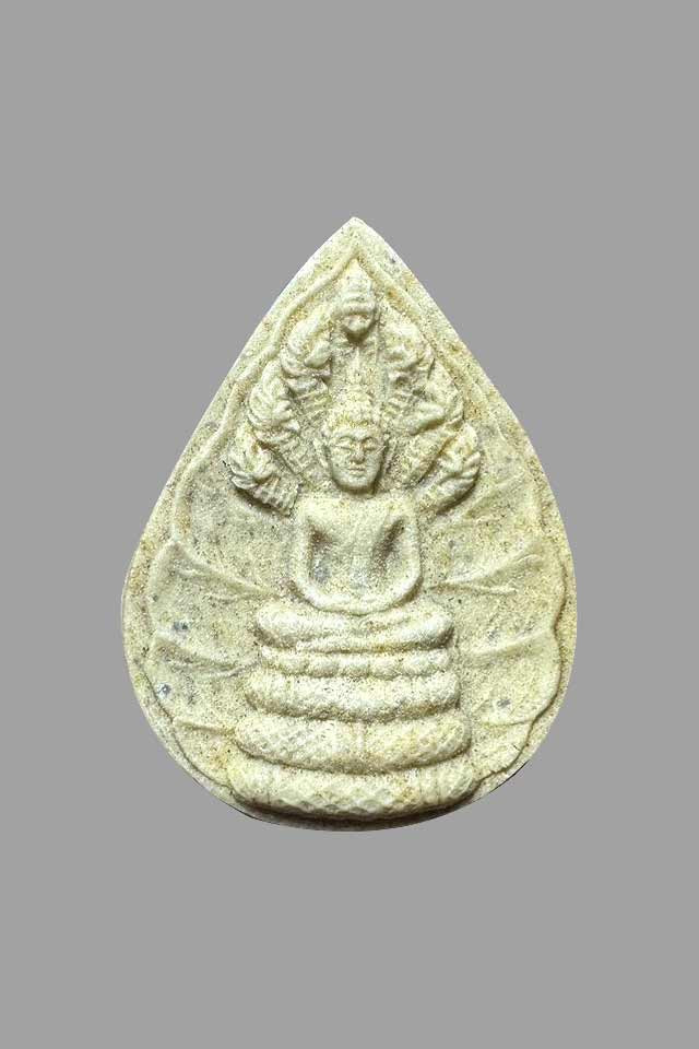 พระผงนาคปรกรูปใบโพธิ์ เนื้อผงขาวบรรจุเม็ดกริ่ง หลังยันต์สาม ลพ.ม่น วัดเนินตามาก จ.ชลบุรี |