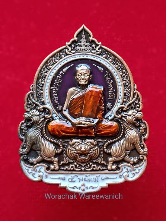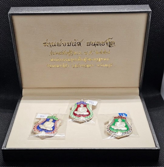 เหรียญนั่งพานสำเภาทอง ไตรมาส 58 เนื้อเงินลงยา หลวงปู่ฮก รตินธโร วัดราษฏร์เรืองสุข จ.ชลบุรี หมายเลข 1112 มีกล่อง แดงเคาะแรก |