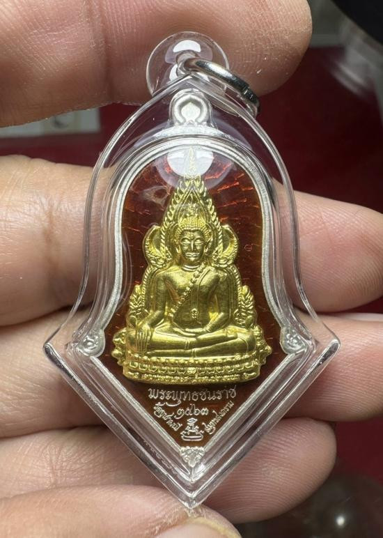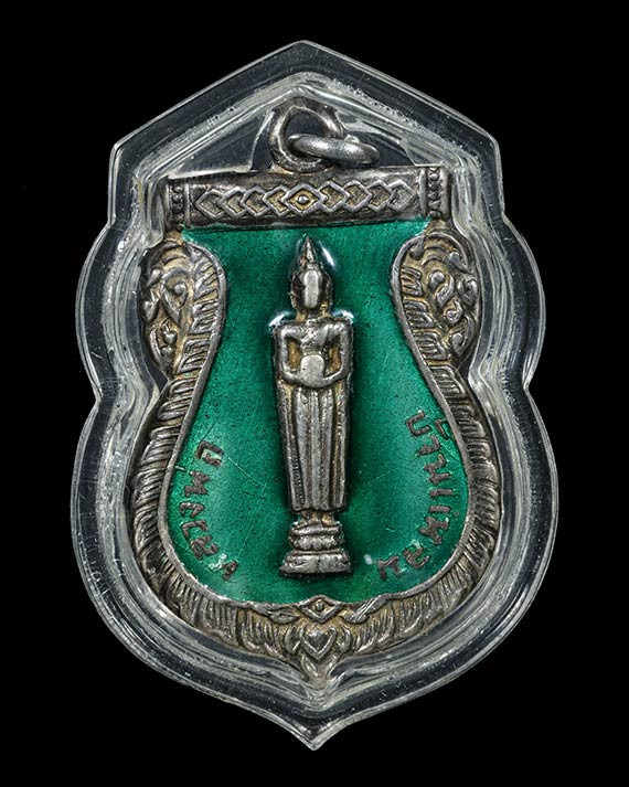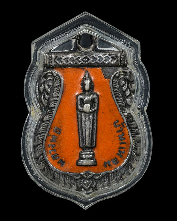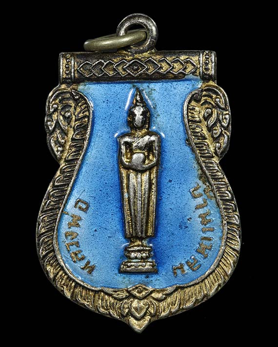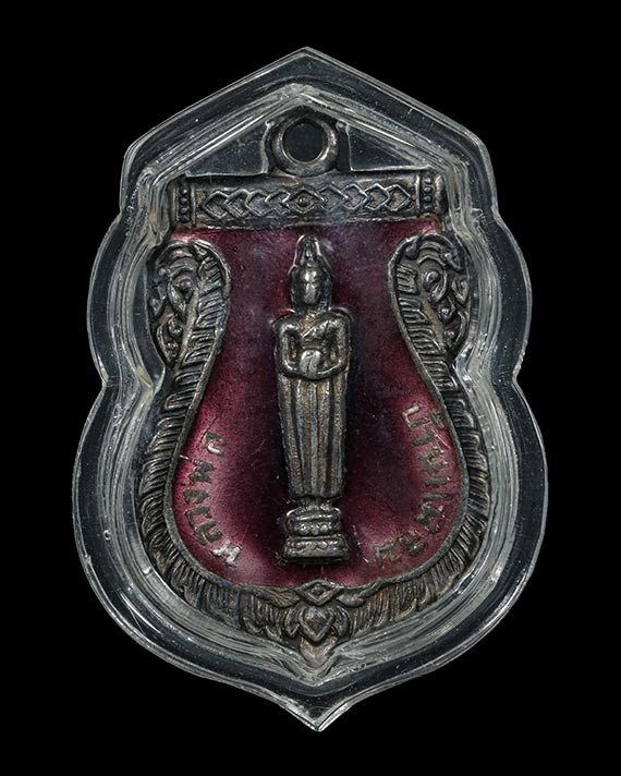 *** ปลดหนี้ *** เหรียญพระพุทธชินราช หลังท้าวเวสสุวรรณโณ พิมพ์จำปีใหญ่ เนื้อเงินลงยาแดงหน้ากากทองคำ หลวงพ่ออิฏฐ์ วัดจุฬามณี หมายเลข ๕๙๕ |