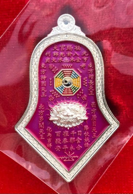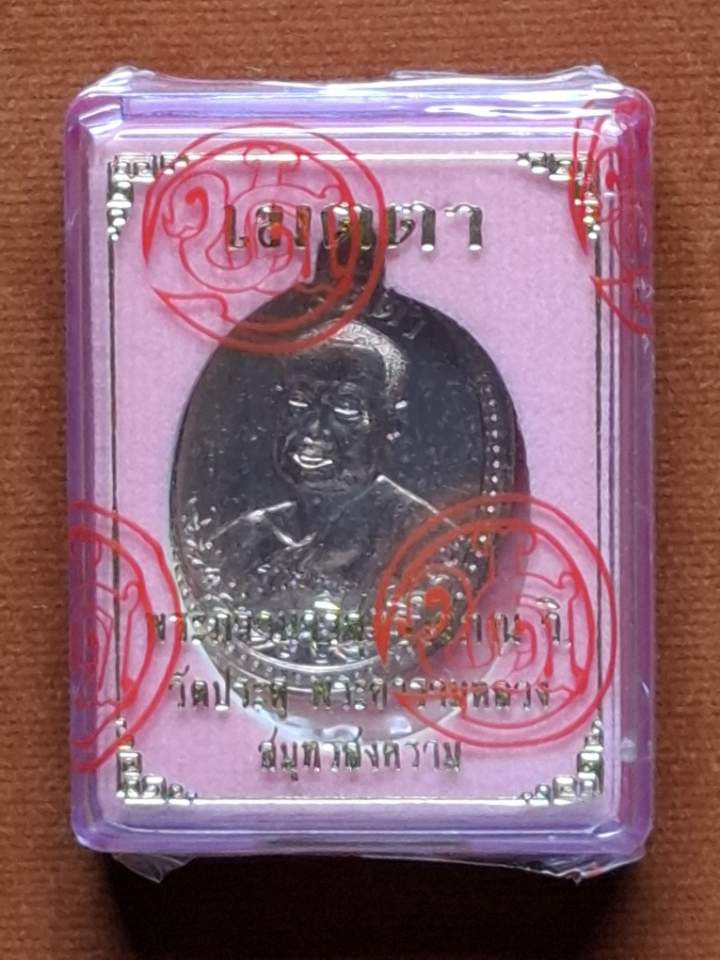 หรียญกันชง ทรงจำปี หลวงพ่ออิฏฐ์ วัดจุฬามณี จ.สมุทรสงคราม เนื้อเงินพิมพ์ใหญ่ ลงยาสีม่วง ซีลเดิมกล่องเดิม |