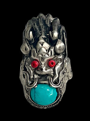 แหวนเงินรูปมังกรคาบแก้ว ปากฝังเทอค้อยน์ตาฝังปะการังแดง งานแฮนด์เมด |