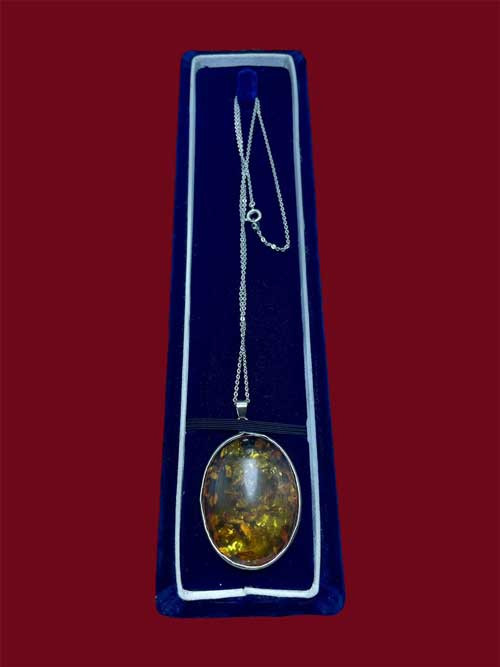 สร้อยคอจี้อำพันเก่า พร้อมกล่องใส่ และสร้อย ที่มีตอกโค๊ต 18KGP |