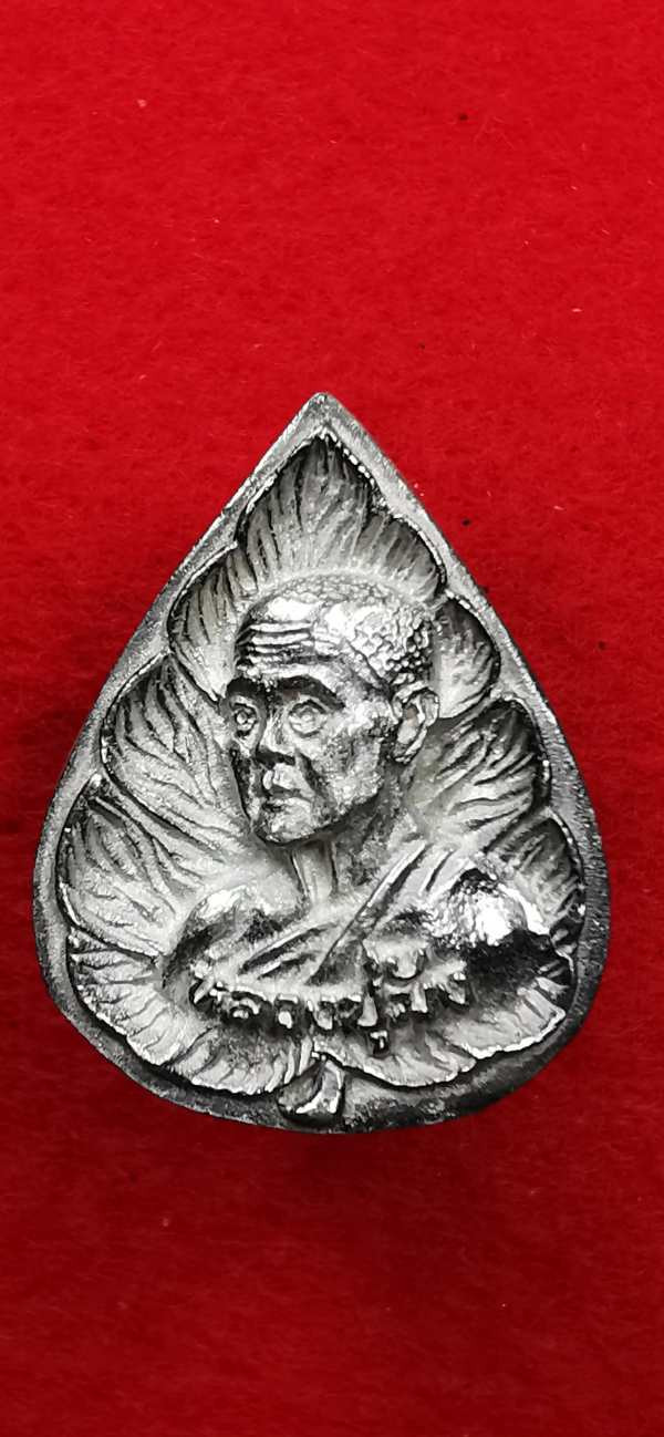 รูปเหมือนใบโพธิ์เนื้อเงินตอกโค๊ต พิมพ์เล็ก ตอกโค๊ต หลวงปู่ม่น วัดเนินตามาก จ.ชลบุรี ปี2533 |