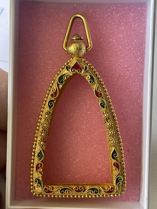 กรอบทองคำแท้ ใส่พระกริ่ง ใส่ชินราชอินโดจีน น้ำหนัก 8.00 กรัม ยิงเปอร์เซ็นต์ทอง 91.54 ครับ |