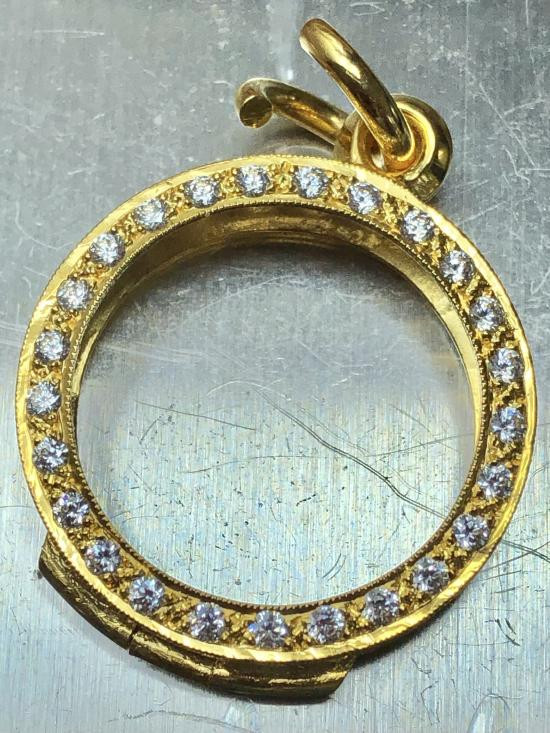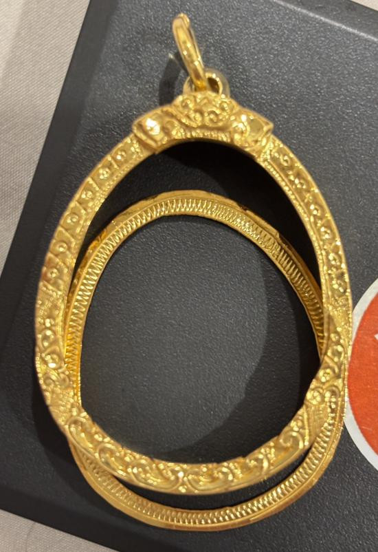 กรอบทองคำแท้ เปอร์เซนต์สูง 75% ทองสั่งทำ หนัก 2.6 กรัม ใส่เหรียญคณาจารย์ทั่วไป *** ไม่มีห่วงพระ นะครับ*** |