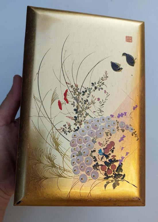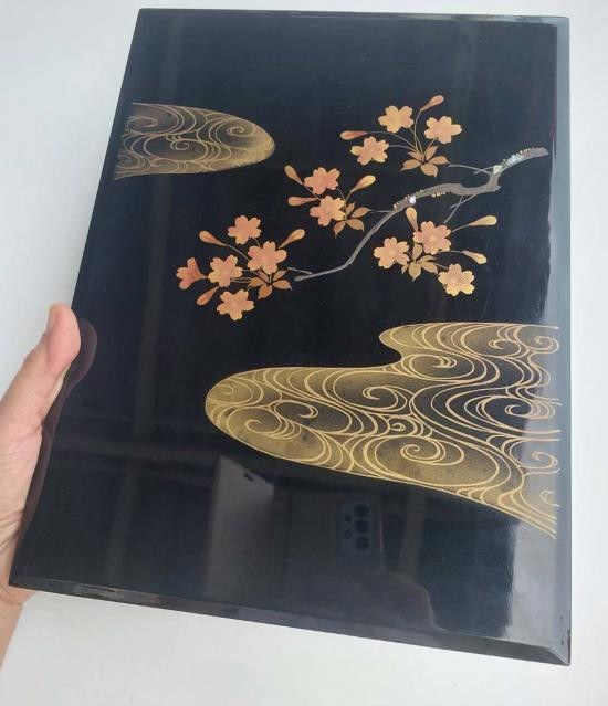 ***วัดใจ***กล่องไม้วินเทจญี่ปุ่น งานไม้ญี่ปุ่นเคลือบเงาแบบ Wajima-nuri พื้นดำลวดลายทองสวยงาม ทรงสี่เหลี่ยมผืนผ้า ขนาด A4 หนา 1.5 นิ้ว |
