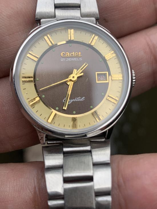 วินเทจ Cadet 17 jewels crystal 38 มิลโดยประมาณ ระบบขึ้นลานด้วยมือ เดินปกติวันที่เปลี่ยนตามเวลาปกติหาสายหนังใส่สวยเลย จัดให้เคาะแรกครับ |