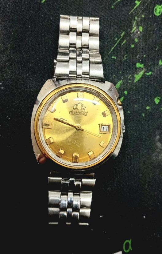 จานบินหน้าทอง 38 มม. ORIENT Automatic 17 jewels เดินปกติวันที่เปลี่ยนปกติ กระจกมีร้าวที่1นาฬิกา มองตรงๆไม่เห็นต้องเอียงดู สายยาวๆ21ข้อพร้อมใช้ครับ |