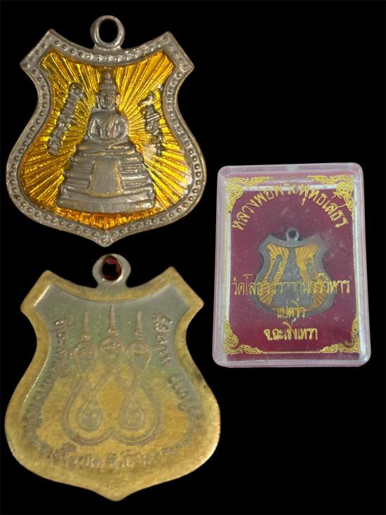 เคาะเดียว 3 เหรียญ 3หลวงพ่อ + พระผง 2 องค์ แท้ไม่ทราบรุ่น ไม่ทราบปีครับ |