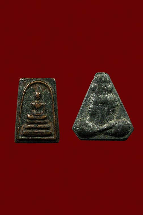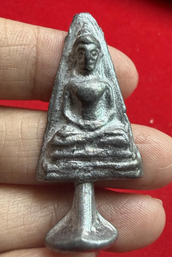 เหรียญสามเหลี่ยมเนื้อตะกั่ว พิมพ์พระพุทธ หลังจารย์มือ ไม่ทราบที่ |