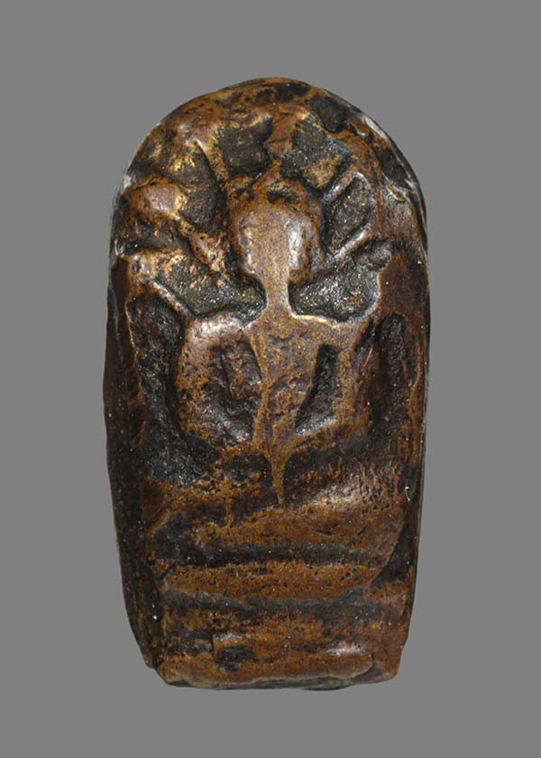 เหรียญปรกมะขาม หลังเรียบ เนื้อทองแดง,ปั้มไม่เต็มมีรอยแหว่ง ไม่ทราบที่ เคาะเดียวแดง |