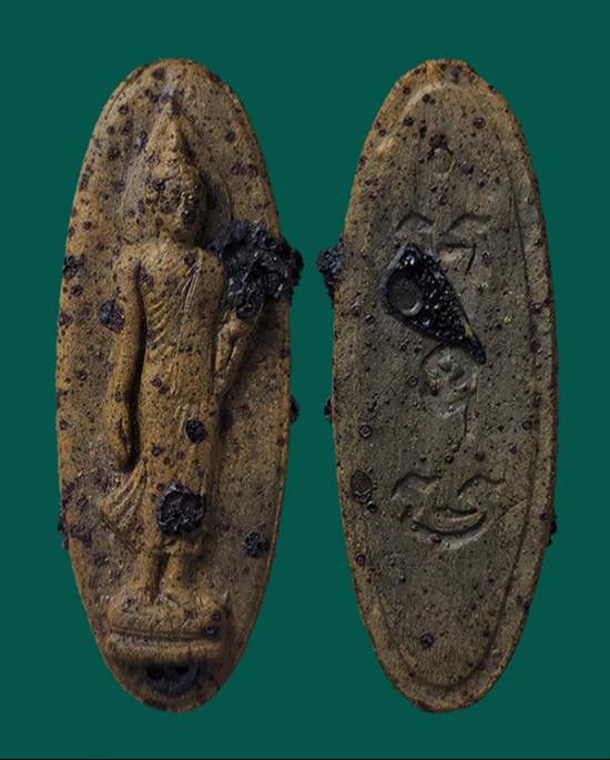 พระพุทธเจ้าชนะมารฐานพระแม่ธรณี เนื้อดินเก่าไม่ทราบที่หลังมียันต์ |