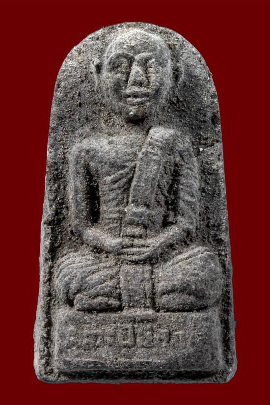 พระผงเนื้อดินหลวงพ่อฤาษีลิงดำฤษีท่องสวรรค์ พิมพ์ใบโพธิ์ ด้านหลังมีปั๊มมั่งมีศรีสุข |